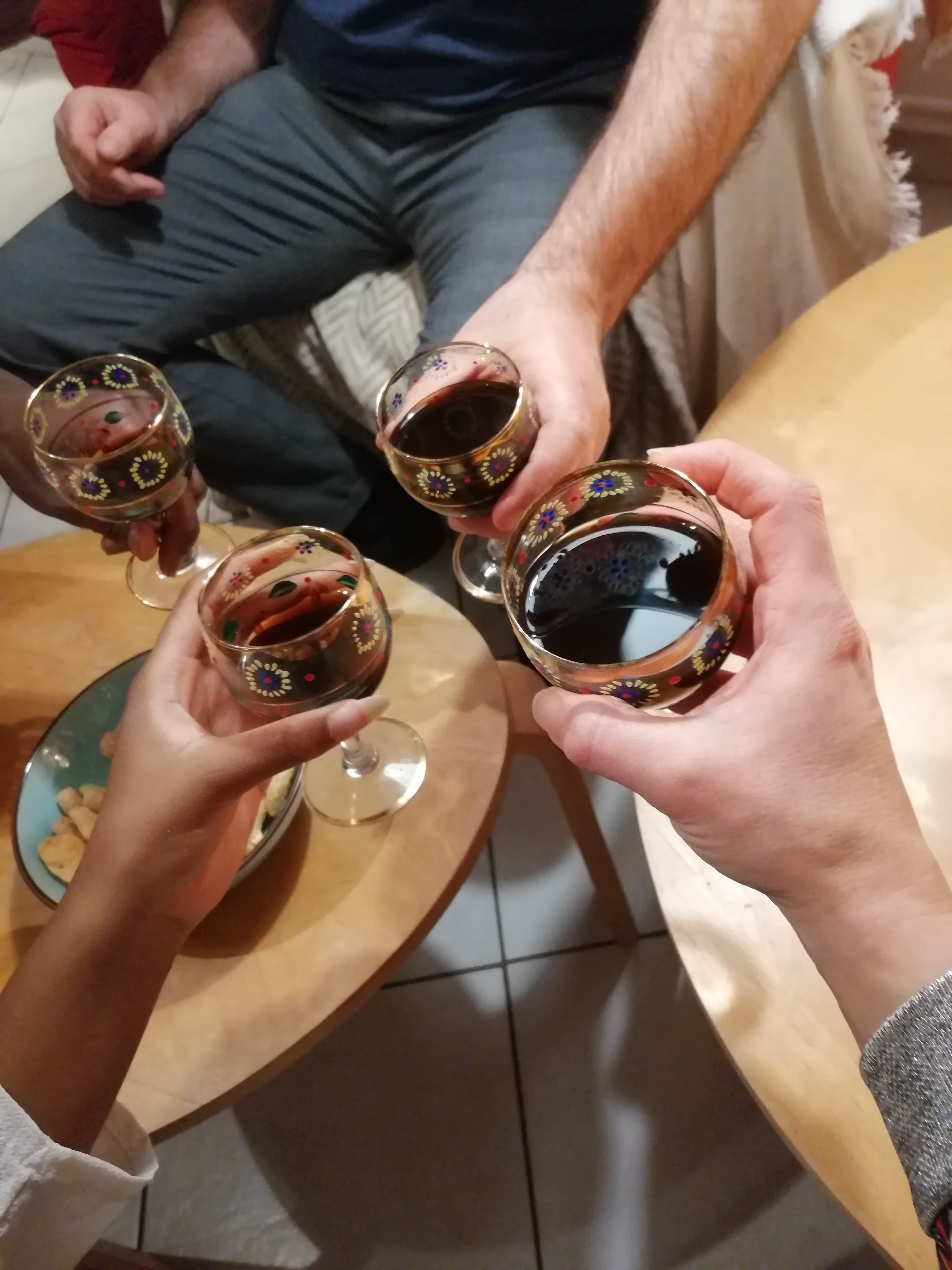 On partage du pain, du vin et du fromages