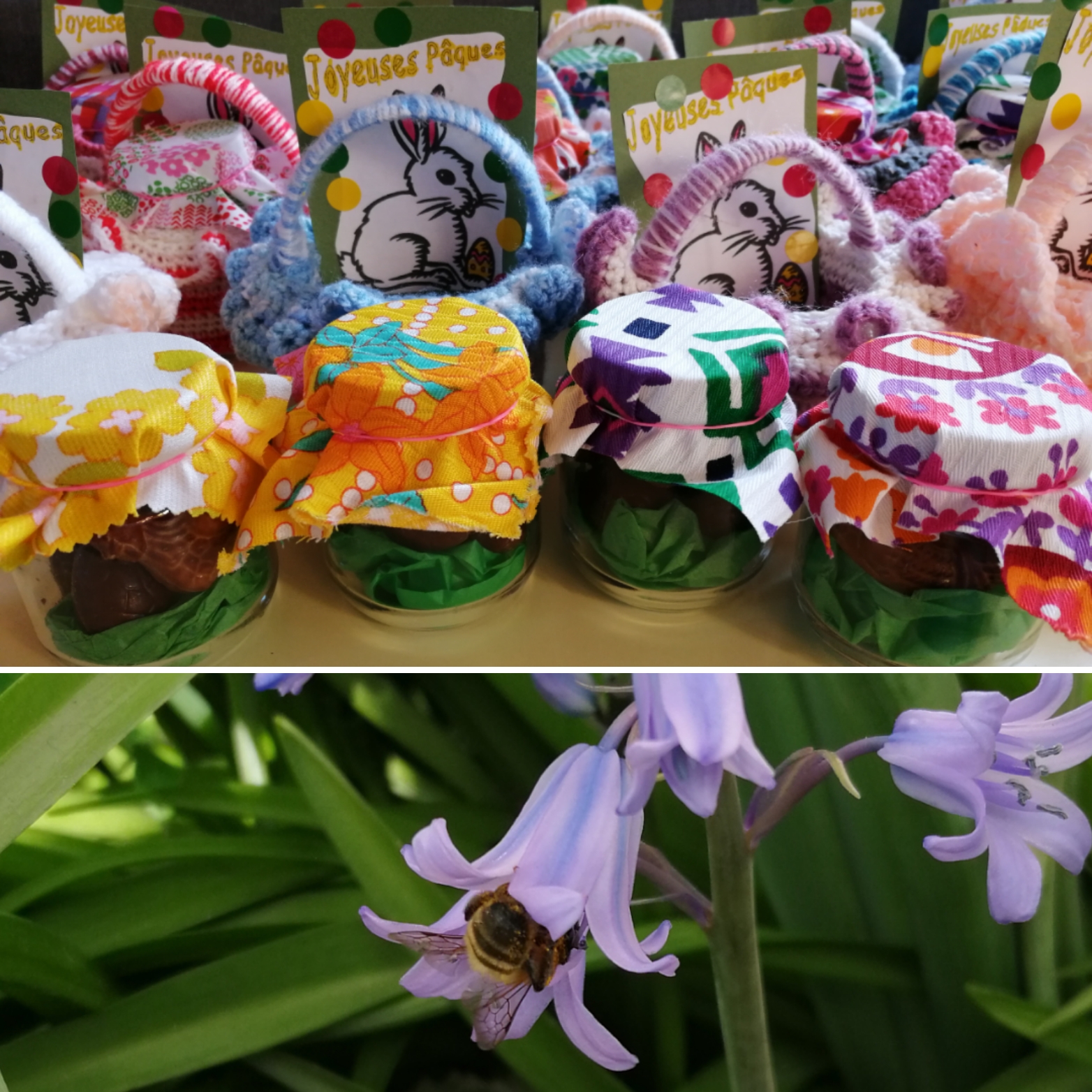 Cette semaine nous finirons de décorer nos petits pots en verre dans lesquels nous avons mis les chocolats en vrac du chocolatier, gagnés, ou échangés plutôt contre nos œufs de Pâques en papier qui étaient cachés dans toute l’école ! C’est devenu depuis plus de 10 ans notre chasse aux œufs préférée ! D’ailleurs le lièvre de Pâques ou Chocoline la poule qui aident les cloches le jour de Pâques, le savent bien et ont adopté le même principe , en secret, avec les parents…c’est la fête aussi dans les familles ! Le chocolat étant devenu une denrée plus rare, on mange moins de chocolat mais de meilleure qualité, éthiquable et bio !