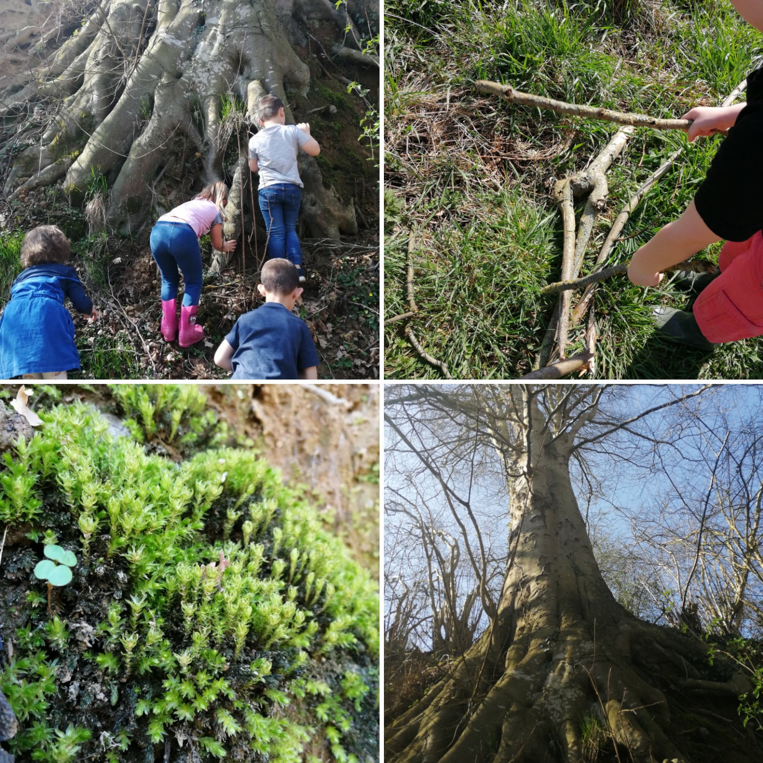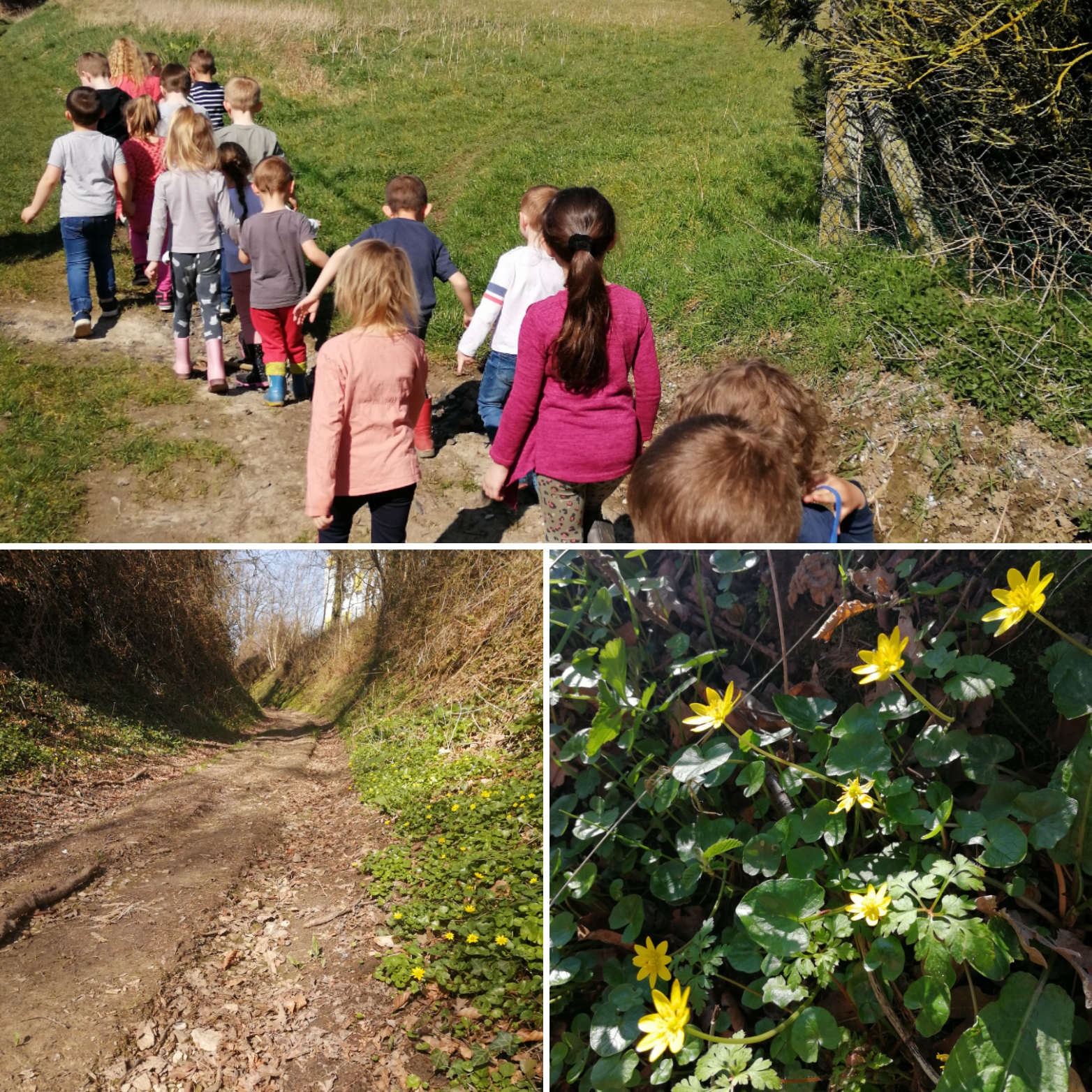 Lorsque nous voulons un peu plus de place encore pour nous défouler, grimper, sauter, faire de la musique avec des branches ou ramasser des coquilles d’escargots, nous filons dans le chemin vert, l’ancienne Rue noire…elle a été ainsi rebaptisée par les enfants il y a 10 ans, et ce fut un nouveau nom adopté rapidement par tous les villageois. Plus aucun papier ou déchet ne traîne maintenant parce qu’un travail important de sensibilisation a été réalisé au fil des années dans les écoles, la commune et il n’y a plus de danger que des petites mains se blessent ! Dans ce chemin vert, la faune et la flore ont repris leurs droits, il n’est pas rare d’y apercevoir des écureuils et toutes sortes d’oiseaux ! Lorsque nous remontons tout le chemin et que nous arrivons au carrefour des quatre vents, c’est la fête !!! des talus sur lesquels grimper, un vieux tronc de tilleul creusé dans lequel se cacher, des branches qui se transforment en xylophone on ne peut plus naturel !!! des chasses au trésor, des jeux de piste, des fleurs à observer et à dessiner, des insectes à observer aussi à la loupe ! Pas besoin d’aller bien loin pour découvrir le monde du vivant, le cycle de vie des plantes parce que l’école au grand air c’est en chaque saison et nous apprenons au fil de l’année à reconnaître les plantes, les arbres, le chant des oiseaux lorsqu’on ne peut pas les apercevoir dans les feuillages…Parfois nous partons toute la journée et nous allons pique-niquer à la ferme des parents d’anciennes élèves…Leur plus grande est d’ailleurs en stage dans ma classe en ce moment !! je savais qu’elle finirait par venir me remplacer un jour !!! la relève est assurée!!!Et c’est la chose la plus gratifiante de savoir que les graines de colibri semées il y a plus de 10 ans ont donné de belles pousses de jeunes citoyens, soucieux de préserver leur environnement proche et plus lointaine à l’échelle de la planète et qui ont envie à leur tour de transmettre !