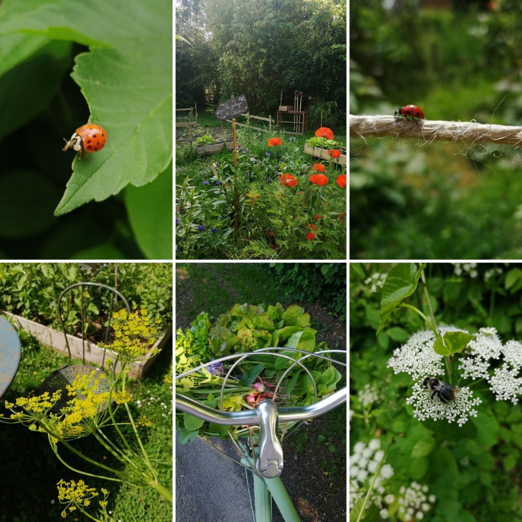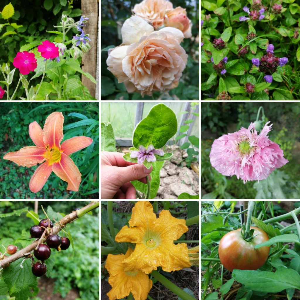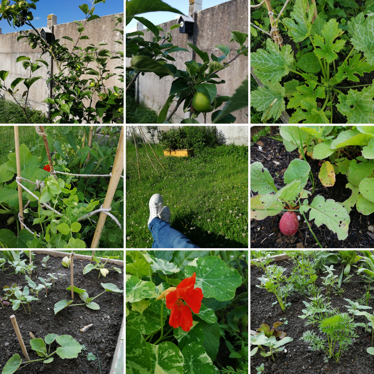 J’avais envie de mettre en photo des avant/après de certains coins du jardin et des carrés potagers mais j’ai renoncé !!! trop de photos à regarder et à trier ! c’est ça le plus long dans un article, mais c’est un peu de ma faute aussi , je prends beaucoup de photos !!! alors, hop hop hop, on ne se plaint plus ! C’est tant pis pour moi ! J’ai donc mis quand même, pour me souvenir, quelques photos d’un potager vert, très vert, très jungle, très fouillis mais qui me le rend bien ! J’en ai passé du temps entre mes routes de petits pois et mes routes de carottes, passé du temps en juin à replanter pieds de courgettes, de concombre, de potiron, de melon, d’aubergine, de poivrons, de cornichons, de tomates….j’en ai mis un peu partout pour voir, pour essayer !!! Parce que c’est ça aussi ma vision du potager, essayer, tester, réussir parfois, rater aussi….et les moments passés après l’école ou le week-end les mains dans la terre m’ont aussi permis de tenir au fil des semaines….
