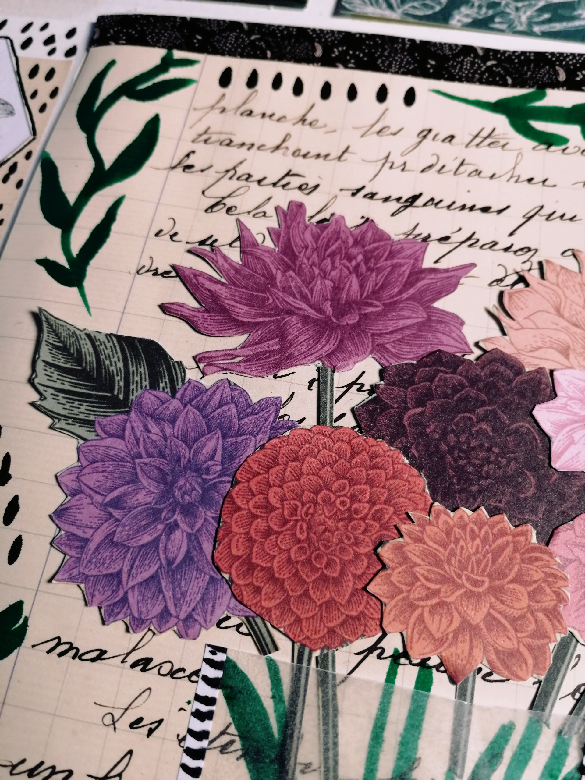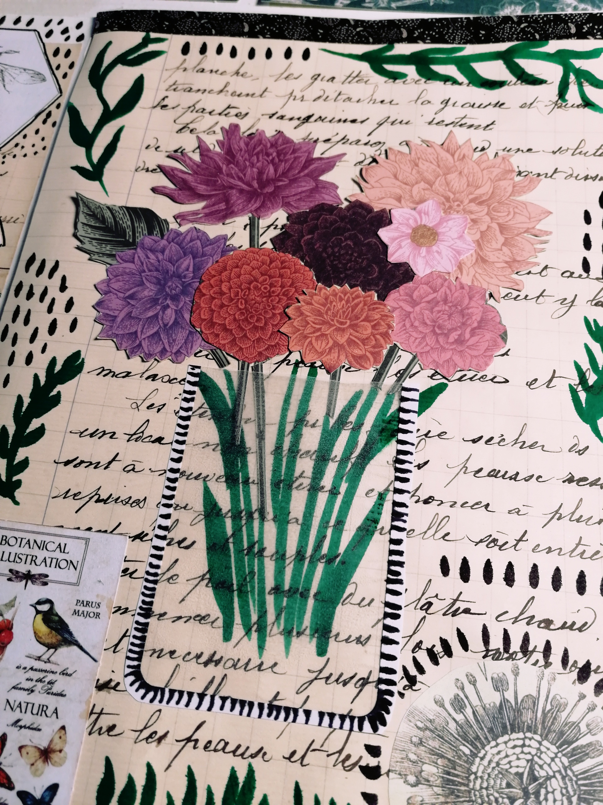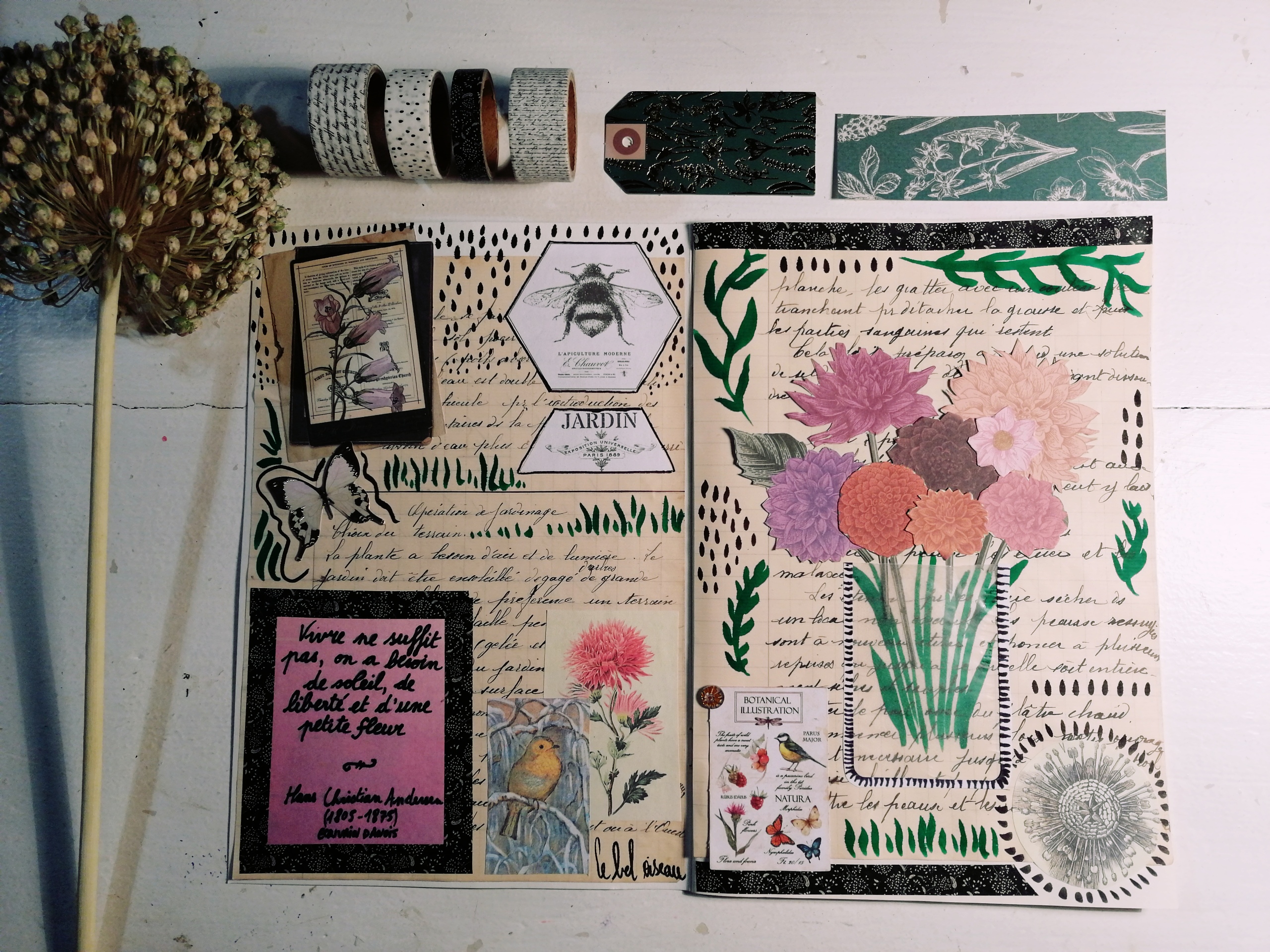 C’est le thème du jardin qui a guidé cette double page, avec un bouquet de fleurs comme point de départ, une jolie idée trouvée chez @lululaberlue, en particulier pour le vase, une étiquette transparente d’une enveloppe récupérée. Les fleurs sont de plus en plus présentes dans notre jardin, plus encore depuis notre passage à l’Herbarium de St Valery sur Somme, il y a trois ou quatre ans, merveilleux jardin, verger d’où je suis revenue avec quelques sachets de petites graines … Nigelles de Damas, ancolies, molènes à grandes fleurs, pastels des teinturiers, salsifis à fleurs mauves, roses trémières…