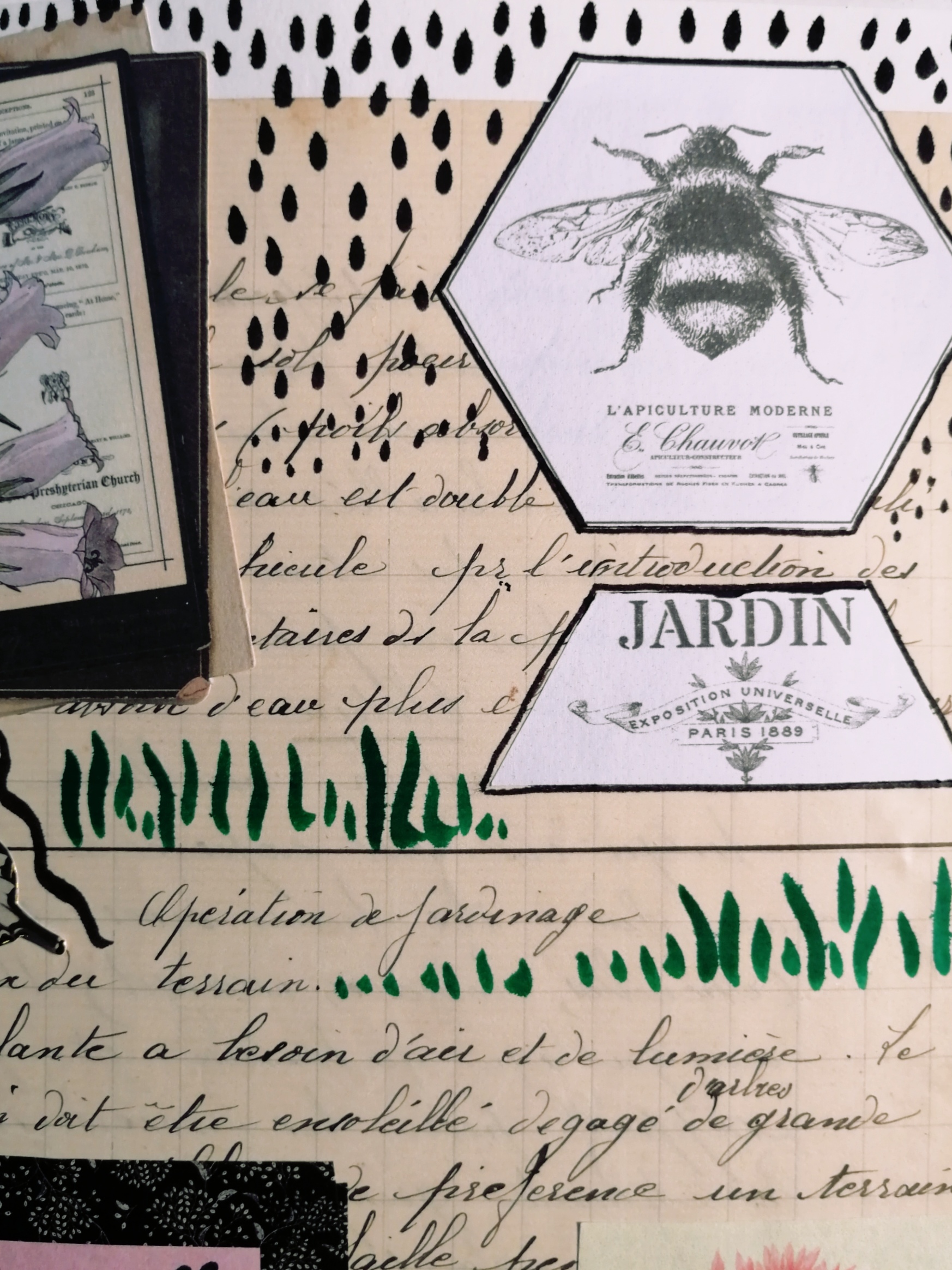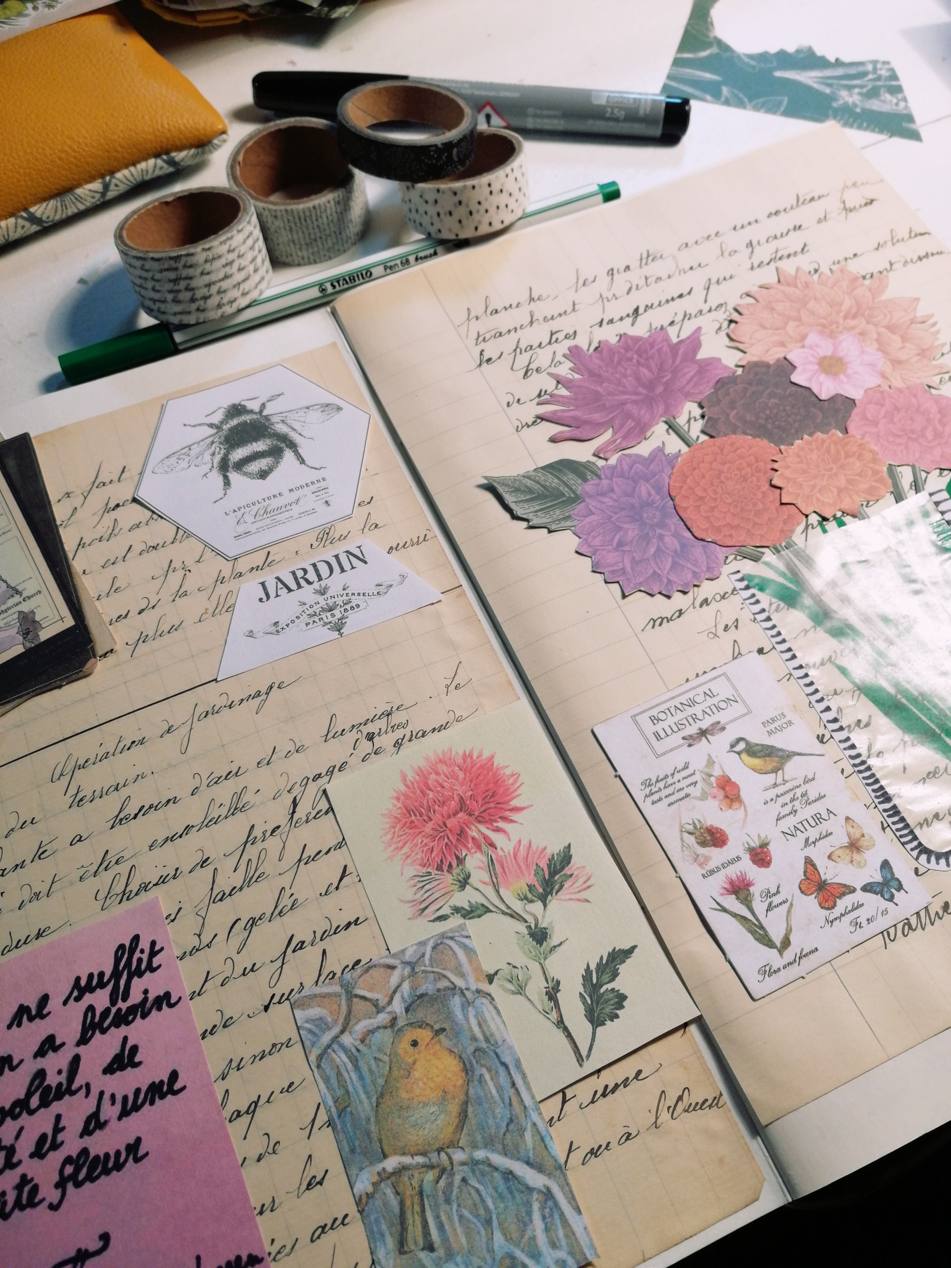 J’ai bien entendu trouvé dans les anciens cahiers gardés précieusement, des pages recouvertes d’écriture à la plume et à l’encre, dédiées à une leçon sur le jardinage ; là aussi quoi de mieux pour accueillir mes collages et dessins !!!