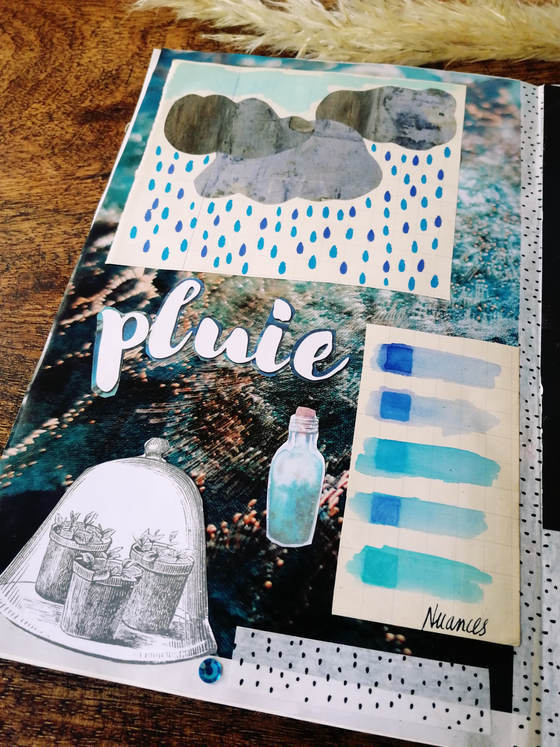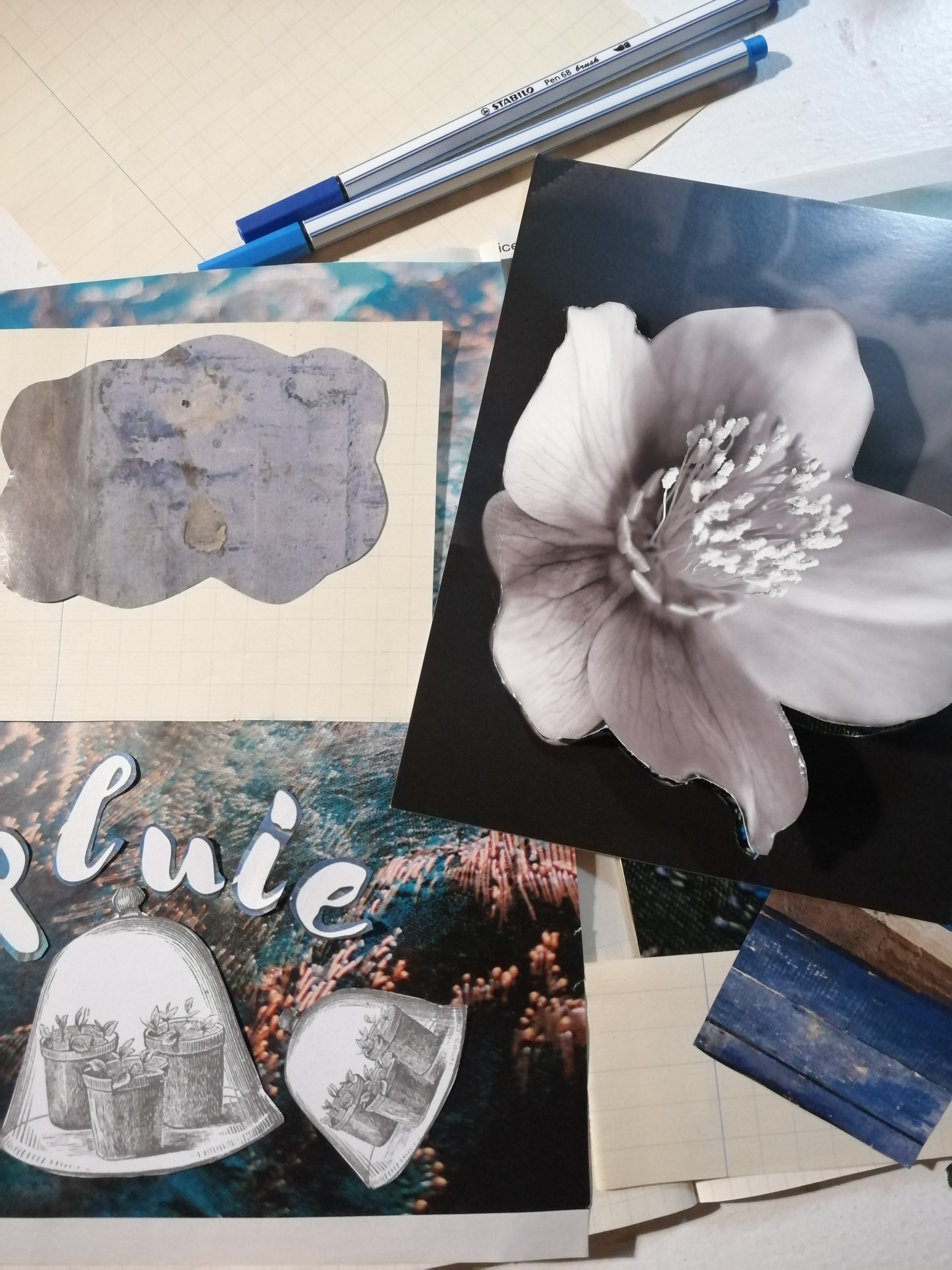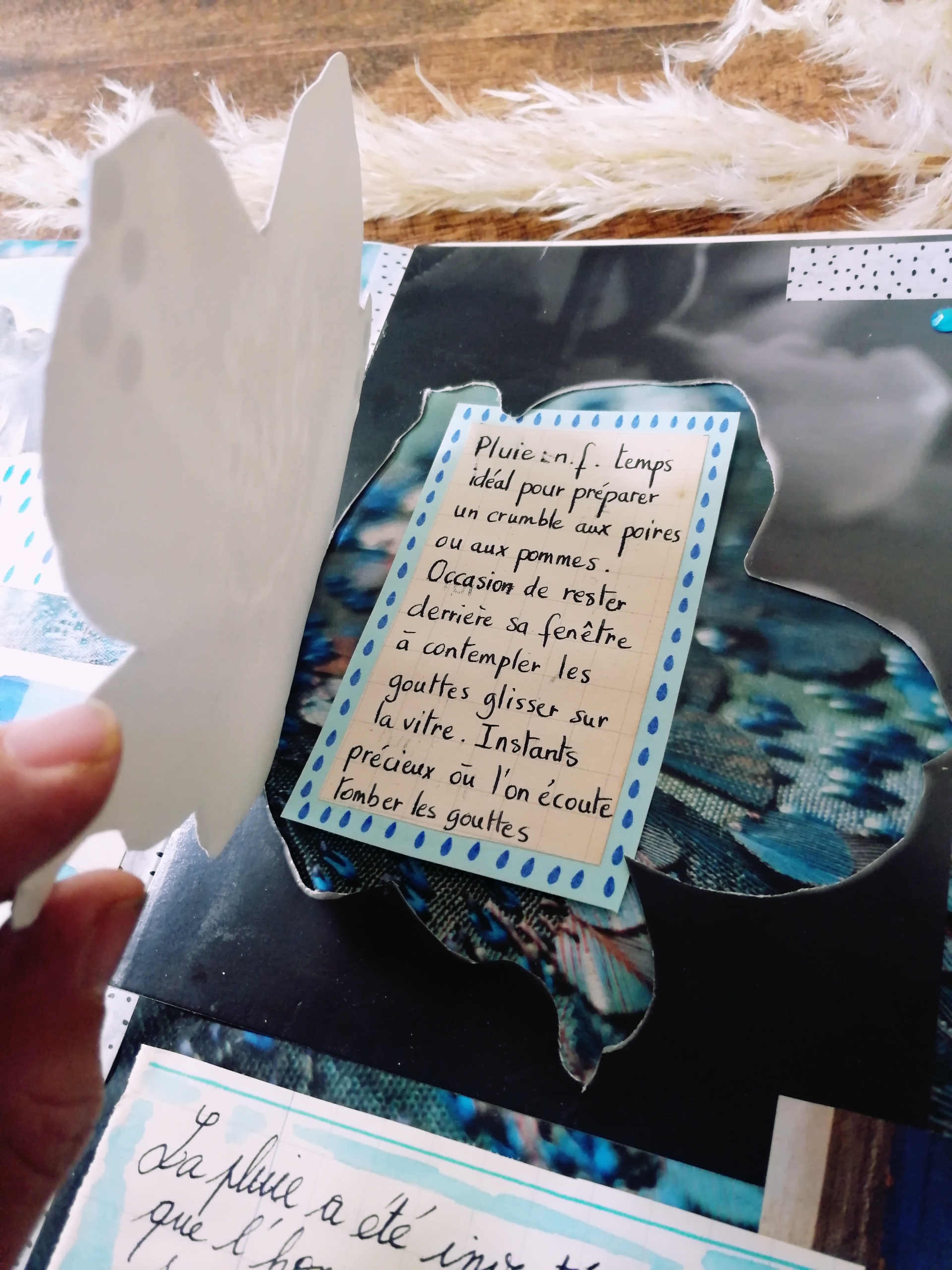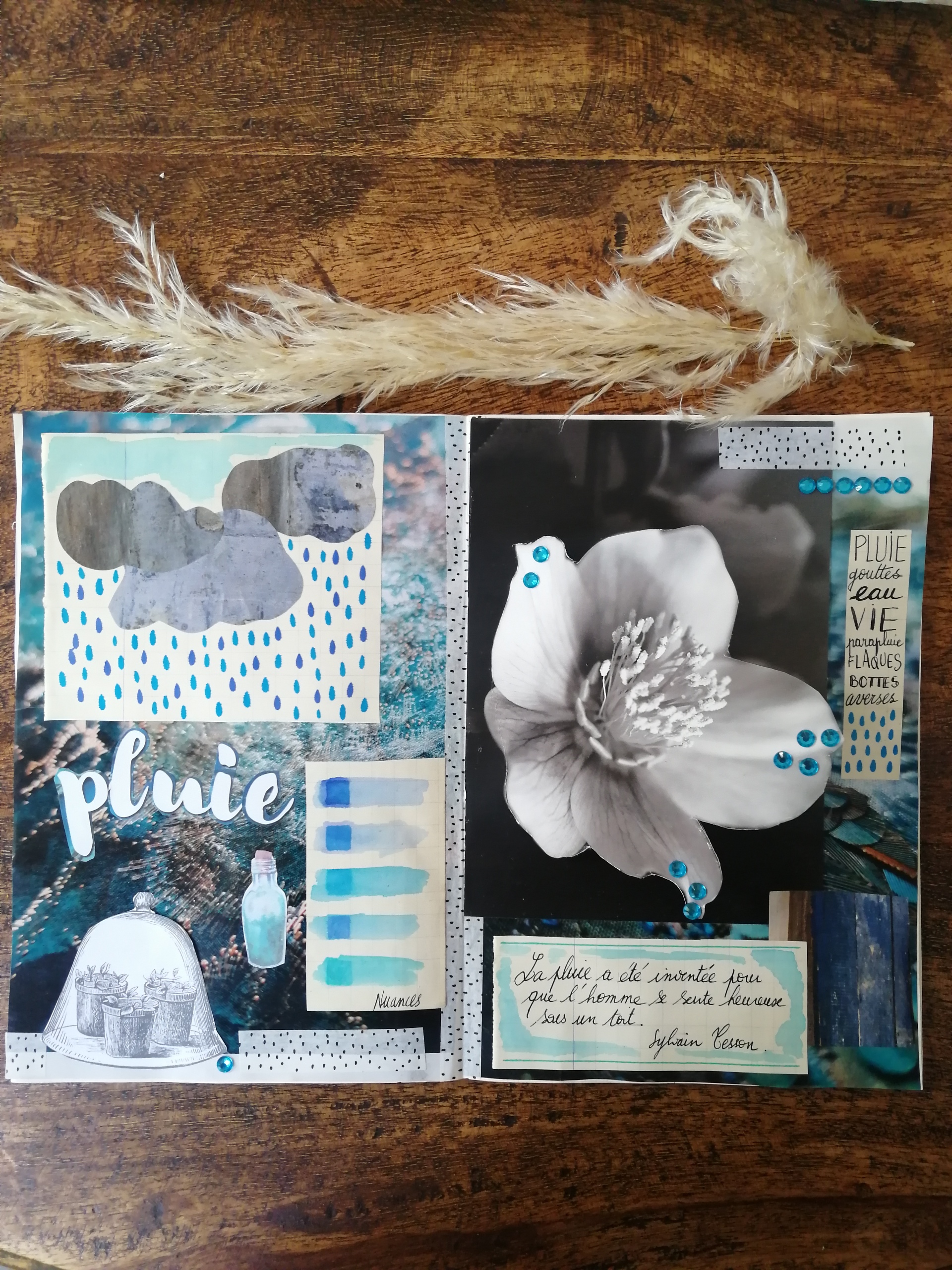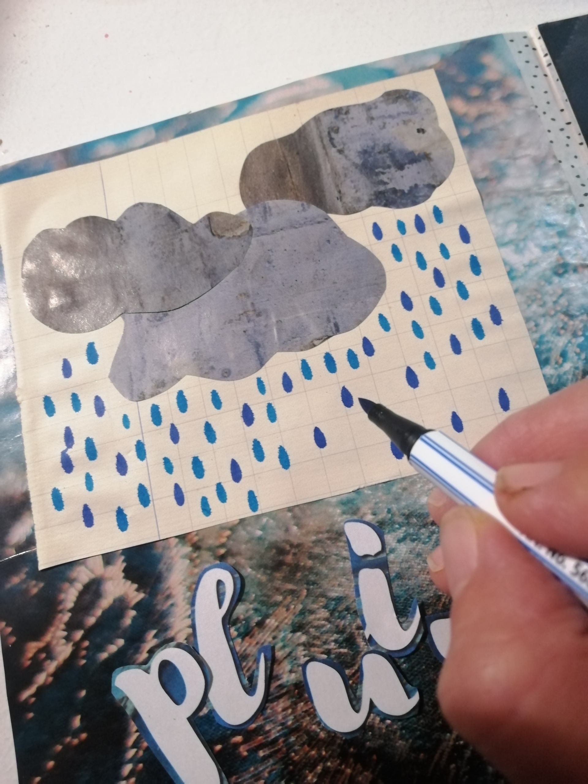 Ces nuances que je me suis amusée à trouver avec mes crayons feutres pinceaux, ces découpages de fleurs recueillant des gouttes brillantes. Ces mots affleurant mon esprit , cette citation revenue en mémoire, cette liste de définitions de la pluie, prétexte à bien des choses à faire. Ces nuages découpés et ces graphismes répétés…