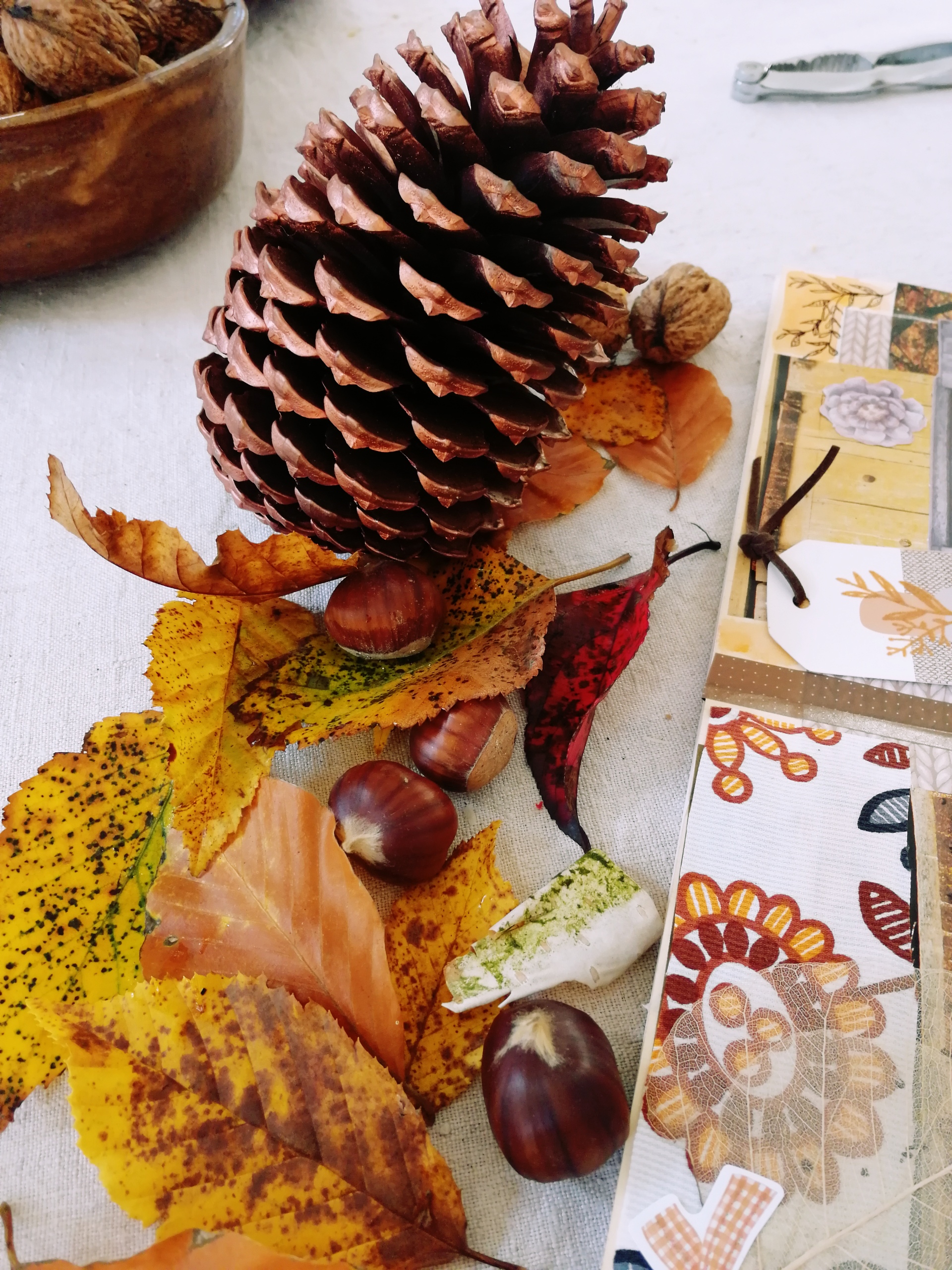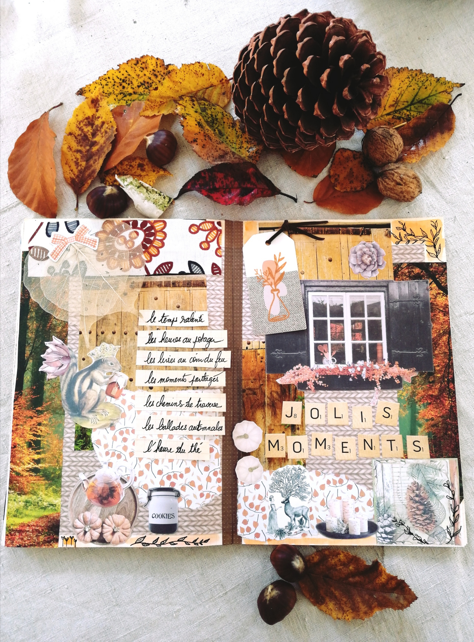 Des pommes de pin collectionnées, qui trôneront un peu plus tard lorsque Noël viendra. Du thé et des cookies, ou des scones ou des petits carrot cakes. Des bougies qui réchauffent et éclairent doucement les soirs qui s’installent plus tôt. Des courges , qui se transformeront tantôt en soupe et non pas en carrosse. Quoique…. Du bois, des matières naturelles, des couleurs chaudes, du hygge….