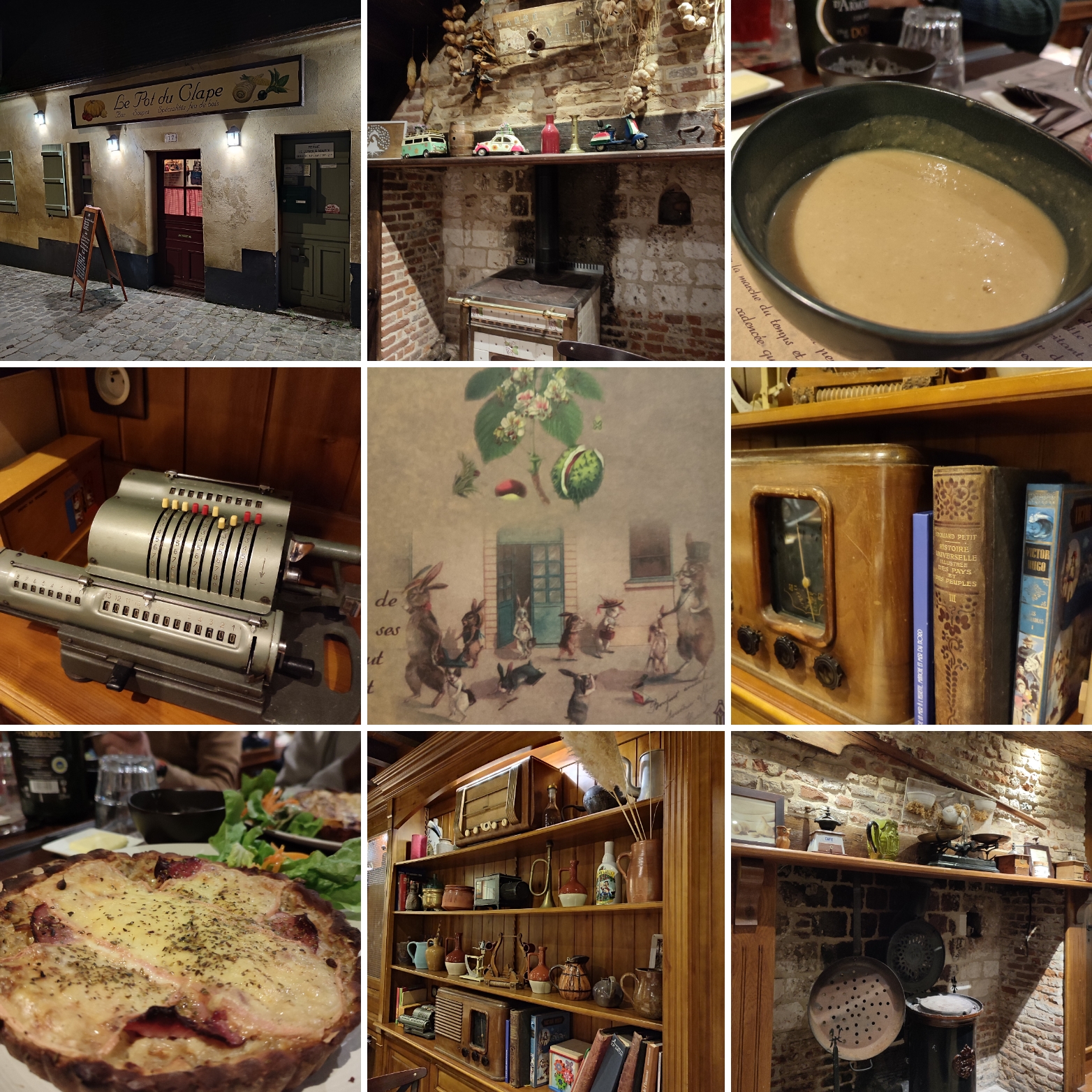 Dernièrement, nous avons découvert la « Froggy’s Tavern », au fond d’une ruelle pavée, dans une très ancienne bâtisse ( une taverne !! ) . Mais je vous recommande aussi deux incontournables lieux dans la célèbre Rue du Clape en Bas, à côté de la rue du Clape en haut ( forcément !! ) à deux pas des remparts. ( Faites attention à ne pas trop vous pencher, la marche est haute ! ) Vous trouverez donc la crêperie du « Clan des Elfes » et le bar à soupes ( mais pas que !! ) « Le pot du Clape ». Deux petits restaurants installés dans de très anciennes maisons de Montreuil. Vous trouvez aussi dans ce quartier des artisans, peintres, bijoutière et autres. Le temps d’un déjeuner, d’un dîner, d’un goûter, vous trouverez toujours une table pour vous « pauser ».