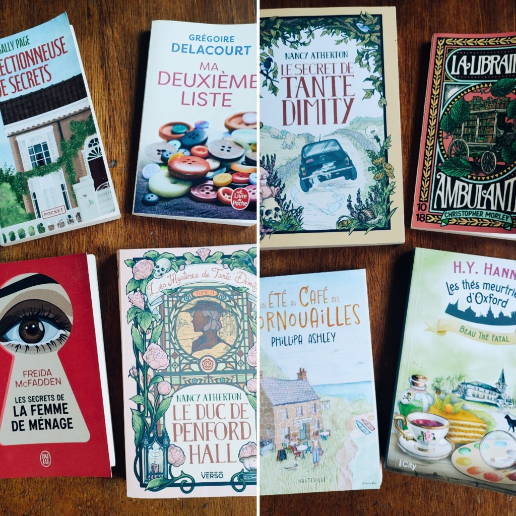 Mes lectures continuent, après celles des vacances « La librairie ambulante » de Christopher Morley, « La collectionneuse de secrets » de Sally Page, « Un été au café des Cornouailles » de Philippa Ashley, « le secret de Tante Dimity » de Nancy Atherton, « Beau thé fatal, les thés meurtriers d’Oxford » de H.Y Anna, « Les secrets de la femme de ménage » de Freida MacFadden, « La librairie disparue » de Evie Woods, « Le duc de Penford Hall » de Nancy Atherton, « Ma deuxième liste » de Grégoire Delacourt… Fichtre j’en ai lu quand même beaucoup !!! Je terminerai sans doute bientôt « Les semeuses » de Diane Wilson