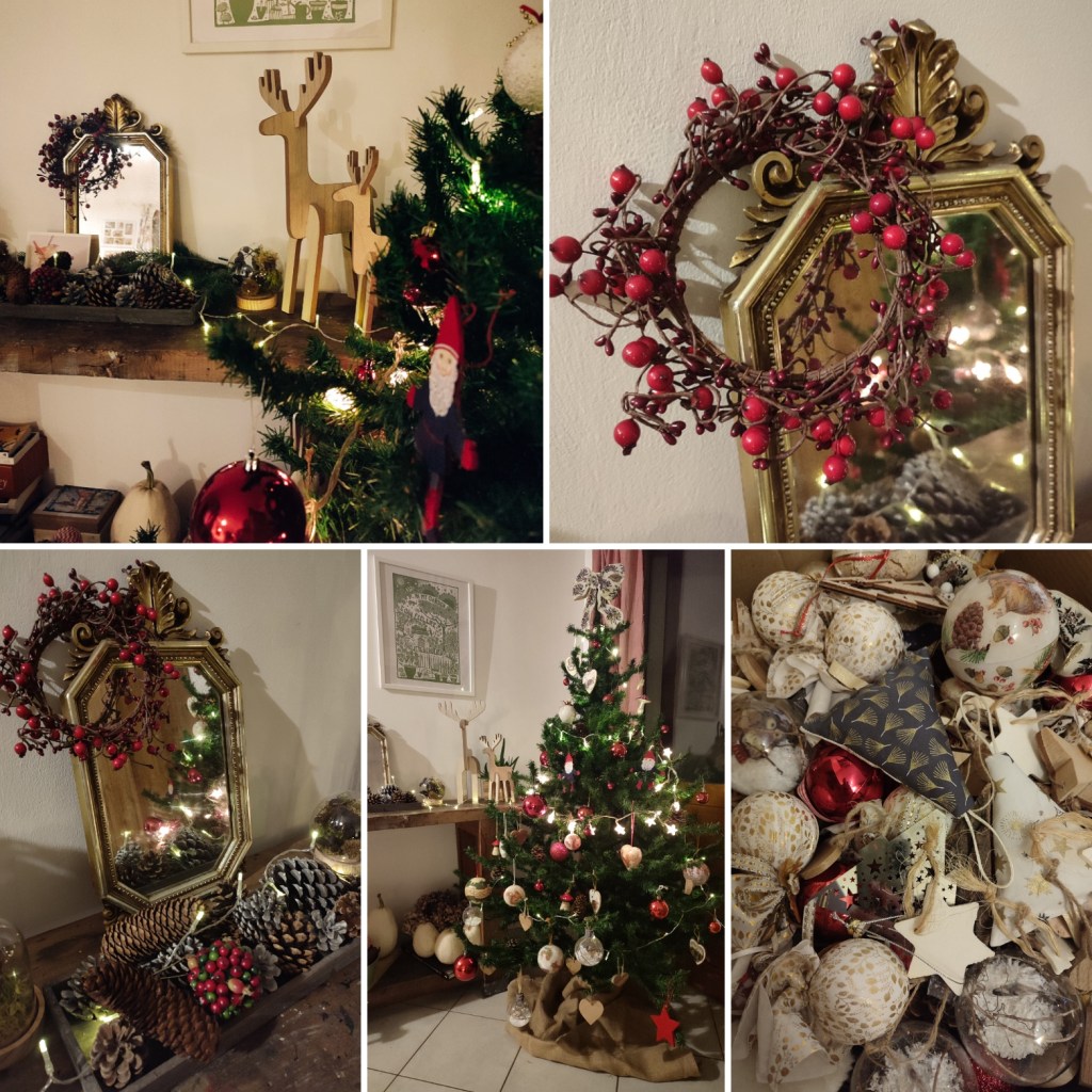 L’un des premiers rituels du mois ici c’est de faire entrer l’esprit de Noël dans notre maison, la décoration sort des cartons et les guirlandes et les lumières s’installent. Je remets depuis des années les mêmes, achetées au fil des ans, chinées, recyclées et c’est parfait ! J’aime y ajouter un peu de nature, branches de sapin, branches de houx, pommes de pin, clémentines ou rondelles d’orange séchées. Il y a toujours eu des décorations à Noël dans la maison de mon enfance, un sapin qui sentait bon la forêt, que nous allions chercher à pied dans le centre-ville, décoré avec des boules dorées et une guirlande lumineuse, des bougies, rouges, une crêche et la famille réunie.