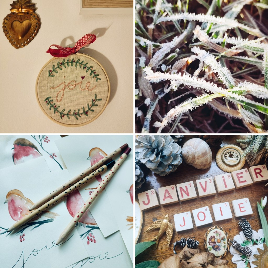 C’est en brodant ce mot en décembre, Joie, que j’ai commencé à écrire ces mots, ces autres mots. C’est en brodant la joie que j’ai su que ce serait mon mot pour Janvier et pour commencer l’année. Je me mets en quête, depuis plusieurs années, à l’aube d’une nouvelle année, d’un mot phare pour celle-ci et je crois vraiment que cette année c’est ce mot qui m’a trouvée.