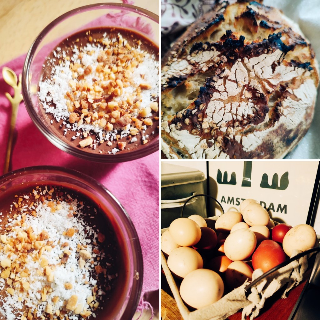 Des bocaux remplis à l’épicerie d’aliments en vrac pour diminuer nos déchets et nos emballages, des légumes de saison, du maraîcher en attendant le retour des semis et récoltes au potager, des oeufs à foison, particulièrement en ce moment, que l’on partage volontiers.